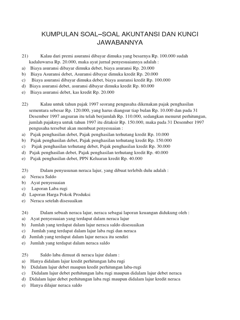 Soal dan jawaban ayat jurnal penyesuaian akuntansi. Berikut ini adalah contoh soal pilihan ganda ayat jurnal penyesuaian. Contoh soal dan jawaban ayat jurnal penyesuaian sampai neraca admin. Klik disini untuk contoh soal dan jawaban jurnal sampai neraca saldo dagang periodik.